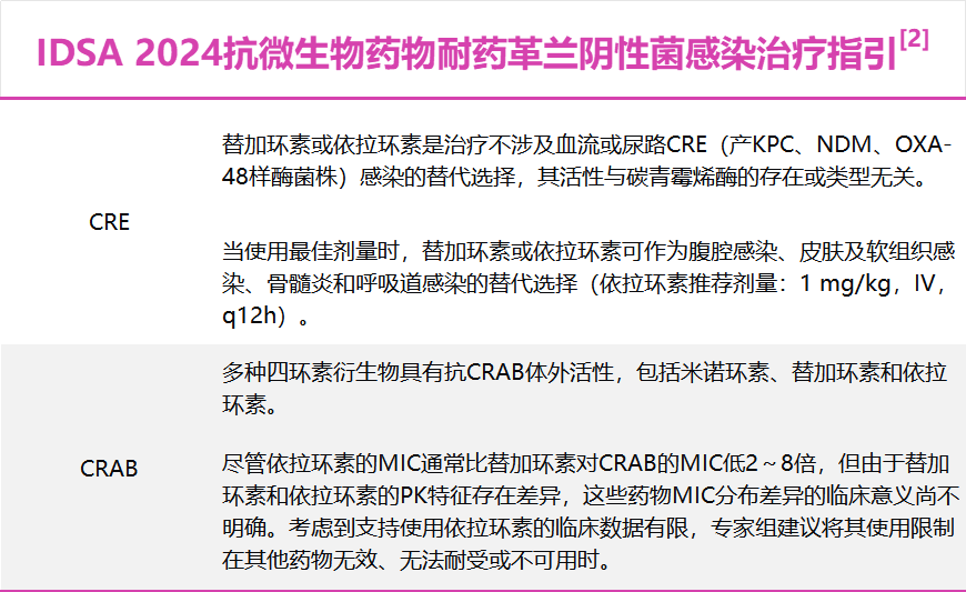 IDSA 2024指南推荐其用于CRE和CRAB引起的非血流/尿路感染,包括腹腔、皮肤软组织和呼吸道感染等,且活性不受碳青霉烯酶类型影响。
