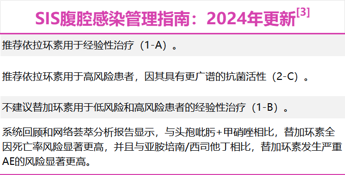 SIS 2024指南明确推荐其用于腹腔感染的经验性治疗(1-A),同时不建议使用替加环素(1-B,包括低风险和高风险患者),凸显了依拉环素在腹腔感染治疗中的重要地位。