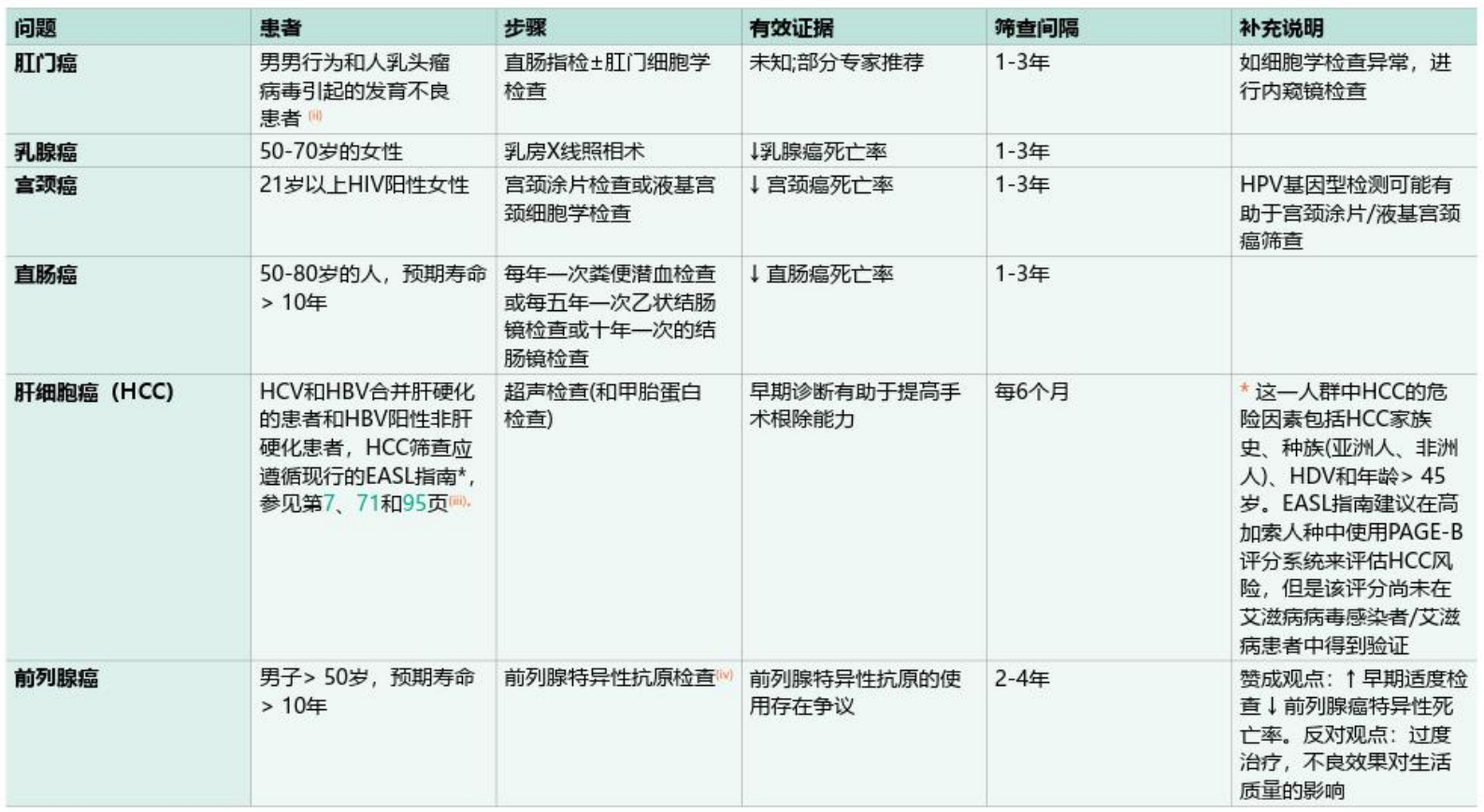 免疫重建不全患者的肿瘤筛查和预防的总体原则可参考其他HIV感染者以及普通人群诊疗指南。EACS指南(下表)对HIV感染者的肿瘤筛查做出了建议,但目前并未针对其中免疫重建不全者提出单独筛查计划[12]。INRs可参考针对HIV感染者总体人群的建议。