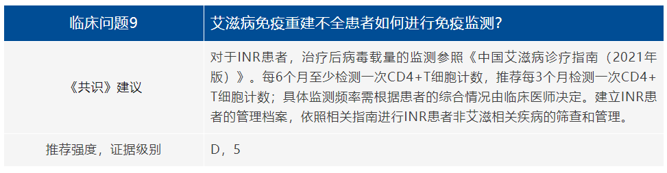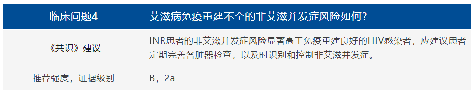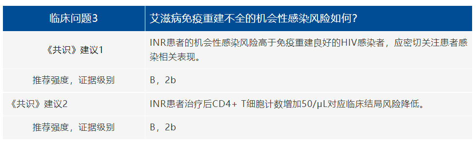 最后,在临床实践中,INRs实际面临的真实临床问题复杂多样,患者的诊疗选择可能受到多种社会生活及经济因素的限制;而本共识中部分临床问题也缺乏来自中国人群的高质量证据,因此,在实际临床诊疗中,具体临床方案的选择需要结合患者的实际情况进行。由于该人群的研究规模尚小,对于其预警、干预和非AIDS相关并发症的具体诊疗仍有待进一步获取高级别临床证据。本共识专家组也将持续关注本领域进展,适时进行共识的更新工作。