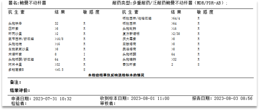 根据2023《临床常用四环素类药物合理应用多学科专家共识》[1],四环素类药物可以作为非典型病原菌引起的社区获得性肺炎的一线治疗药物,而目前临床上常用的几种四环素药物而言,替加环素容易导致肝功能异常及凝血功能异常,依拉环素在上皮衬液和肺泡巨噬细胞中浓度更高,且对碳青霉烯耐药鲍曼不动杆菌(CRAB)感染的疗效优于替加环素,而IDSA等指南并不推荐奥马环素治疗CRAB及CRE。对于本患者而言,有慢性乙肝病史8年余,有肝功损害及凝血功能损害表现,同时患者免疫力低下,目前在ICU治疗,有出现CRO等多重耐药菌院内获得性感染的高危因素,且mNGS显示有多种G-菌及非典型菌合并感染,因此,7月28日调整方案为左氧氟沙星(750 mg,qd)、依拉环素(50mg,q12h)、头孢哌酮舒巴坦、艾沙康唑抗感染治疗。随后,7月31日、8月3日、8月4日,多次培养提示多重耐药/泛耐药鲍曼不动杆菌(MDR/PDR-AB)阳性。考虑耐药感染严重,且为MDR/PDR-AB;体外研究显示依拉环素与多黏菌素等多种抗菌药针对CRKP、CRAB等具有协同相加作用[2],且患者肾功能良好,遂于8月3日调整为左氧氟沙星(750 mg,qd)、依拉环素(50 mg,q12h)、多黏菌素B、艾沙康唑抗感染治疗。