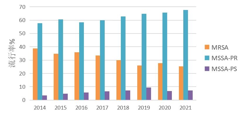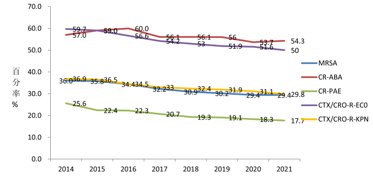 图2 2014年至2021年中国主要耐药菌流行趋势