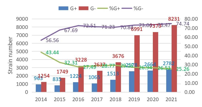 图1 G+和G-菌株分布