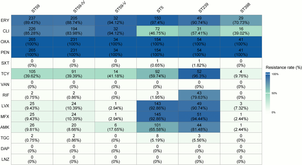表1 中国不同MRSA分子型别的药物敏感性