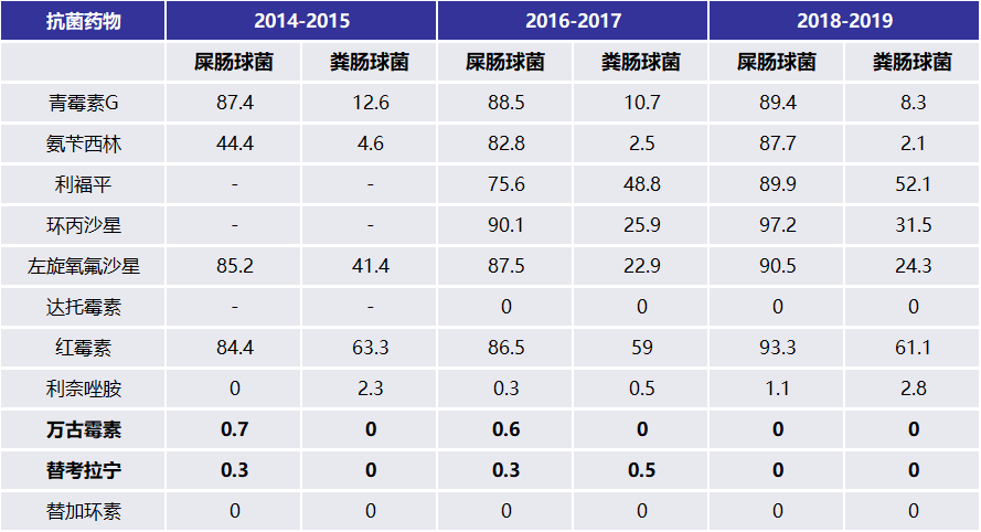 表2显示了肠球菌的耐药变迁,其中万古霉素、替考拉宁、替加环素一直保持着较好的疗效。