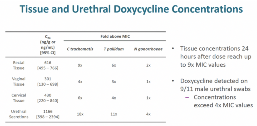 该研究结果表明,多西环素可有效分布用于直肠、阴道黏膜中,并产生持久的、超过MIC的浓度;黏膜组织的多西环素浓度(C24)能够达到数倍于沙眼衣原体、梅毒螺旋体的MIC水平,但仅相当于淋病奈瑟球菌的MIC水平,尚不清楚这种差异的原因。