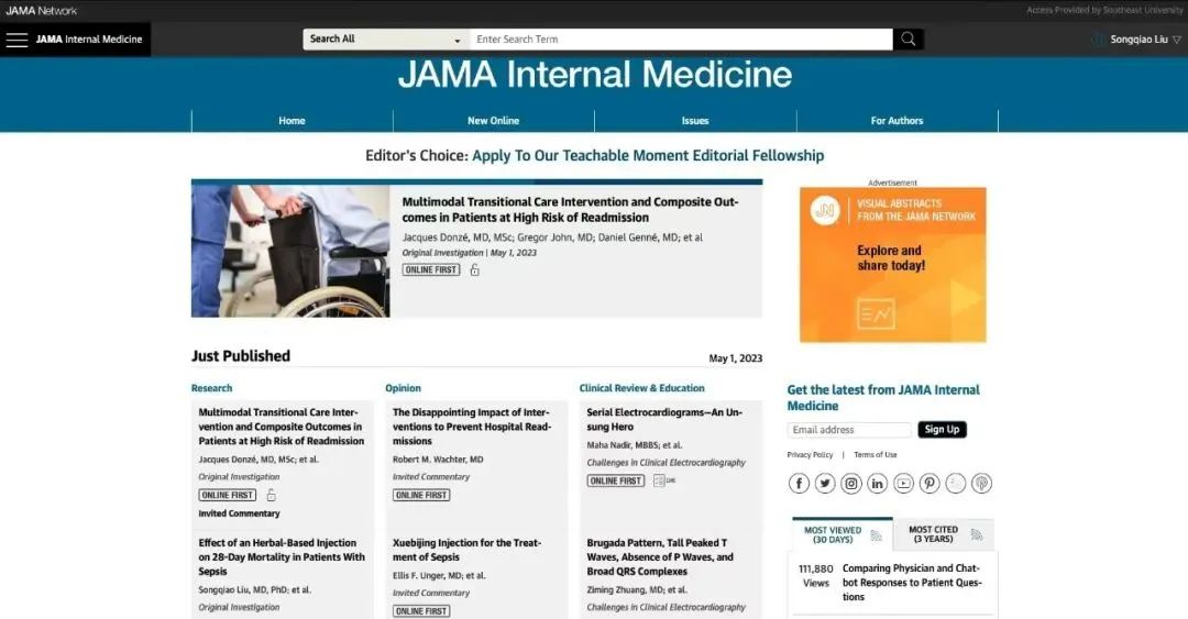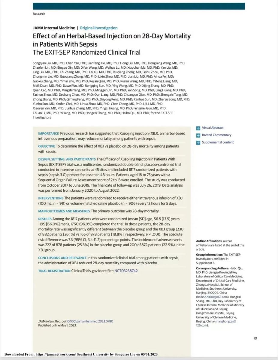 5月1日,由东南大学附属中大医院重症医学科邱海波教授牵头的研究团队,在国际权威期刊《JAMA Internal Medicine》(JAMA?内科学)发表了题为“一种中药注射剂对脓毒症患者28天病死率影响的随机对照临床研究(Effect of an Herbal-Based Injection on 28-Day Mortality in Patients With Sepsis: The EXIT-SEP Randomized Clinical Trial)”的临床随机对照研究结果。这是中药随机对照研究结果首次在该刊发表。