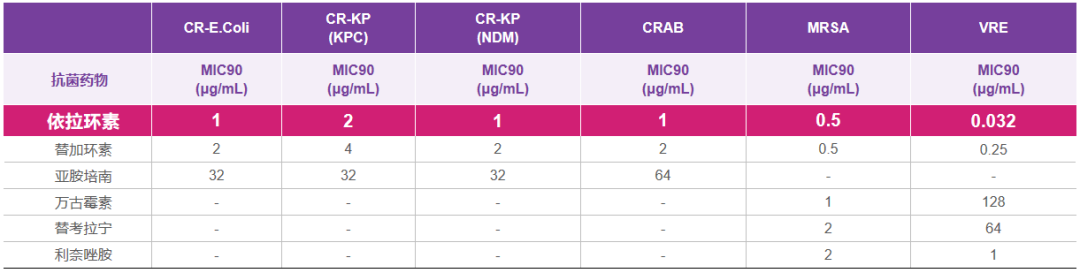 △体外药敏试验显示依拉环素对CREC、CRKP、CRAB、MRSA、VRE保持较低的MIC90