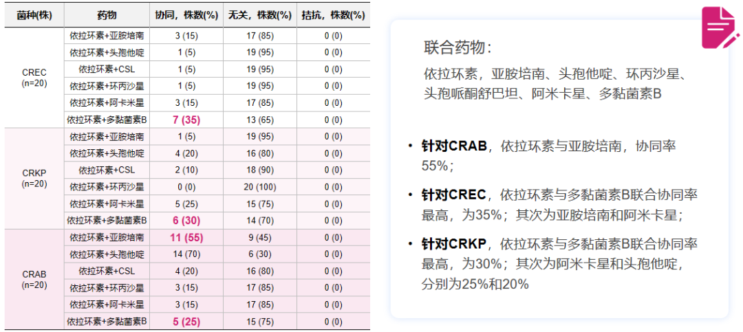 △体外药敏试验显示依拉环素与多种药物联合可对CRAB、CREC、CRKP产生协同相加的抗菌作用