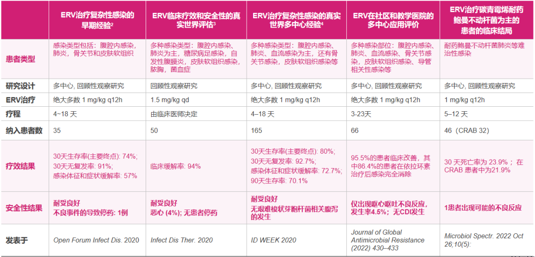 依拉环素的国内外获批,主要基于国际IGNITE 1/4试验以及国内桥接试验的积极结果(见下表),证实依拉环素治疗复杂腹腔内感染(cIAI)的疗效不劣于碳青霉烯类药物,而且腹泻等胃肠道反应的发生率更低。在真实世界研究中,依拉环素的疗效和安全性再次得到印证,而且拓展了抗感染治疗的应用场景,包括肺炎、骨关节和皮肤软组织感染、糖尿病足、脓胸、血流感染、导管相关感染等(见下表)。