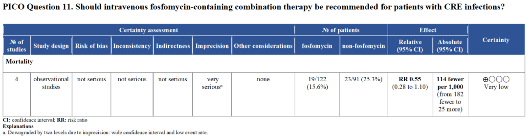 ESCMID指南:如前所述,体外磷霉素等药物敏感以及无法获得β-内酰胺酶抑制剂的CRE所致严重感染患者,可以使用一种以上的体外活性药物进行治疗(有条件的,证据质量中等)。
