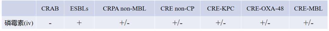 磷霉素对产ESBLs细菌、非产MBL型CRPA以及大多数酶型CRE仍保持敏感或中介,对CRAB无效。