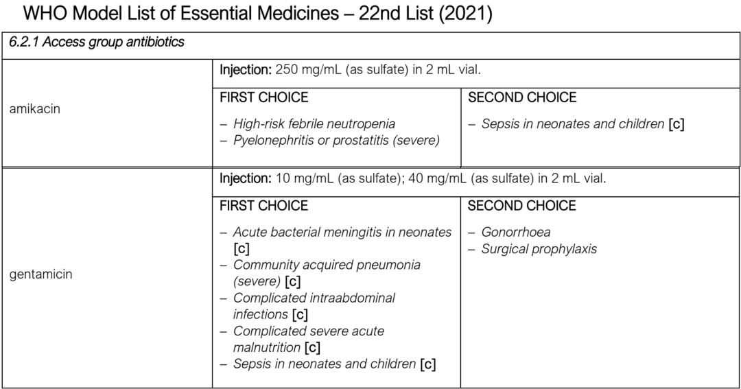 其中,根据安全性、有效性和药物经济学的评价,氨基糖苷类抗菌药阿米卡星(amikacin)和庆大霉素(gentamicin)被列入可及组,而且也被纳入儿童基本药物目录。阿米卡星可用于治疗高危发热性中性粒细胞减少症和严重肾盂肾炎或前列腺炎的一线抗菌药物,治疗新生儿和儿童脓毒症的二线治疗药物;庆大霉素(gentamicin)可作为治疗新生儿急性细菌性脑膜炎、严重社区获得性肺炎、复杂性腹腔内感染、复杂性严重急性营养不良、新生儿和儿童败血症的一线抗菌药物,作为治疗淋病、手术预防的二线选择。