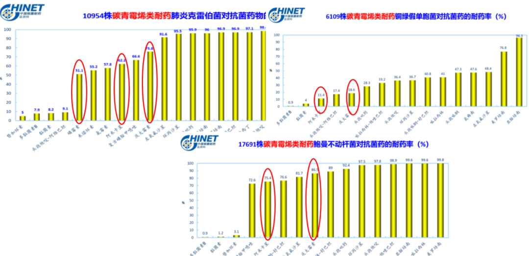△CHINET监测数据:CRKP、CRPA、CRAB对不同抗菌药的耐药率