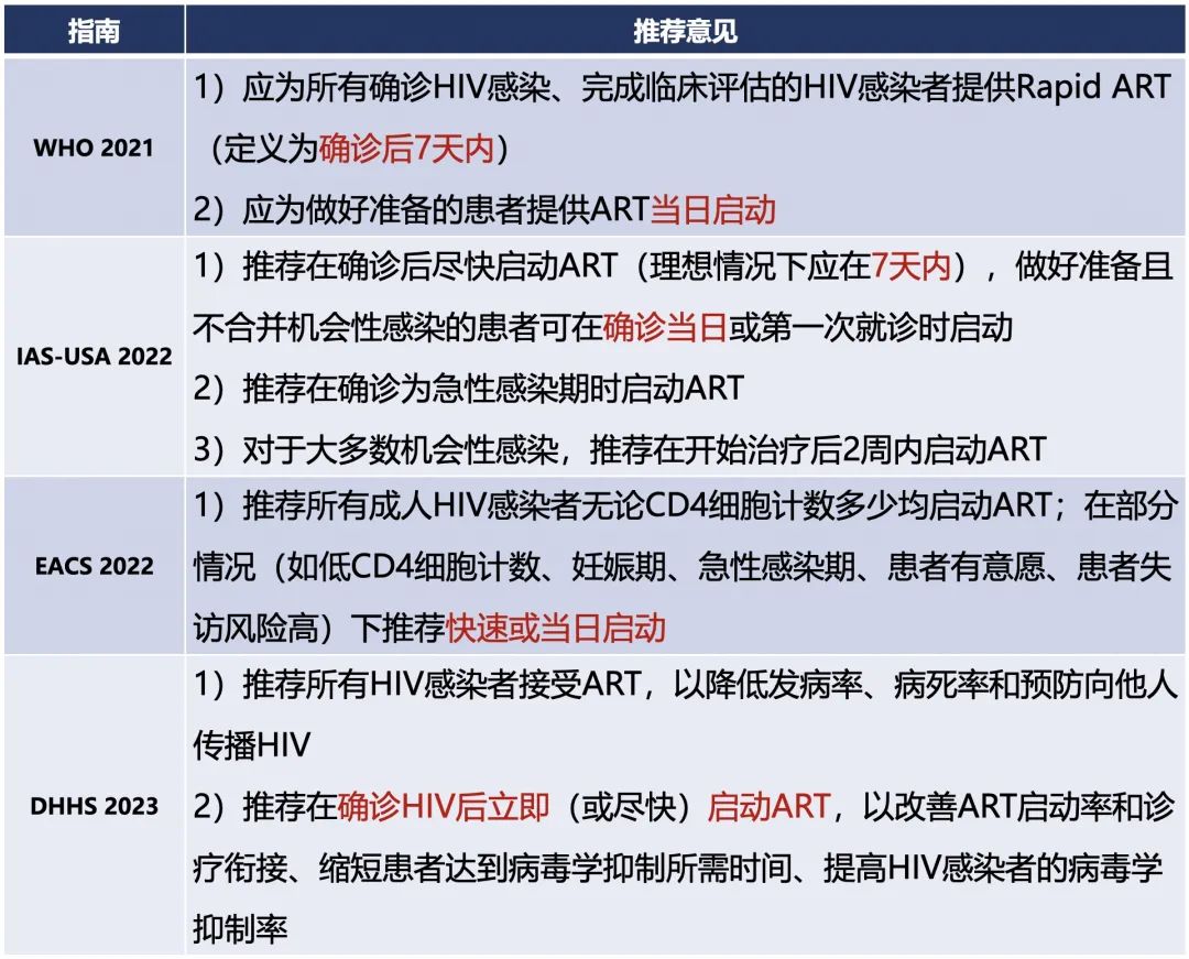 WHO、IAS-USA、DHHS和EACS指南对快速启动ART时间的推荐[8-11]