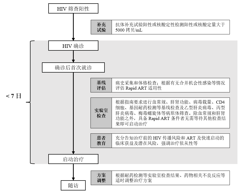 快速启动ART前,同样需进行必要的基线评估和充分的患者教育。对于确认具备快速启动条件的患者,可在病毒载量、CD4细胞计数等基线实验室检查结果出具之前启动ART,并按照现行诊疗指南要求在启动治疗后2-4周内进行复诊。及时追踪各项实验室检查结果,必要时根据实验室检查结果(如耐药检测报告)调整药物方案。