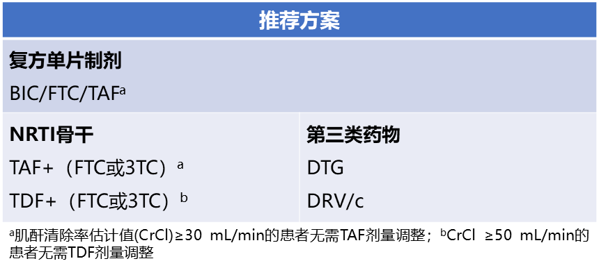 由《共识》的推荐可以看出,三联方案中第三类药物的选择大多为整合酶抑制剂(INSTI),基于INSTI的三联方案具有高耐药屏障,其中B/F/TAF是唯一一个各指南推荐用于快速启动,特别是确诊后当天启动的复方单片制剂,不受基因型耐药检测结果、HBV合并感染、病毒载量和CD4细胞计数的影响,且服药简便性更高,有助于提高患者依从性,另外,相比含TDF的方案,含TAF的方案具有更高的骨肾安全性[9-11]。