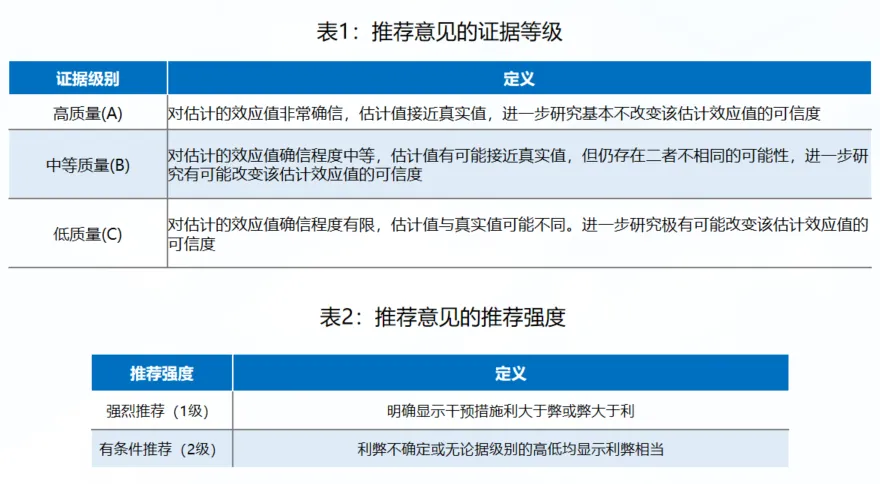 该共识主要基于国内外循证医学证据,形成可供临床参考的推荐意见。这些意见的证据等级和推荐强度见下表。