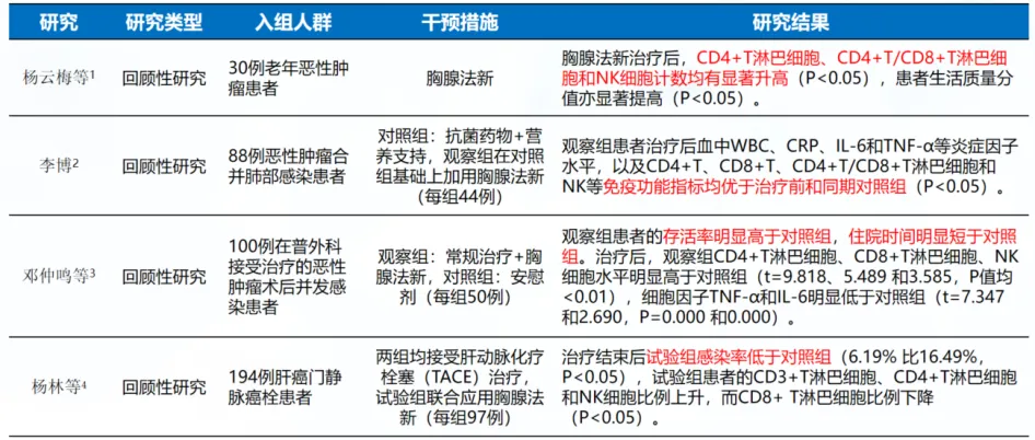 表1. 胸腺法新在肿瘤患者感染防治中的应用相关研究