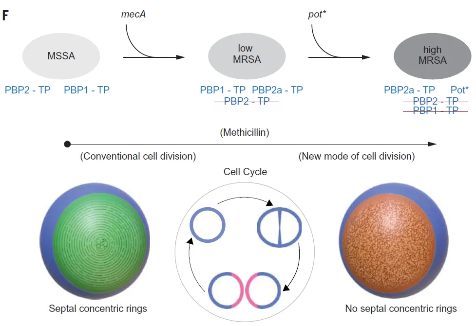 进一步的分子分析发现,高度耐药性MRSA可以在高浓度抗生素环境中切换到第二种分裂模式,这一模式由rpoB基因突变介导。在PBP1活性缺失的情况下,rpoB突变以及其他几种pot突变使得隔膜形成独特的致密网状结构,维持了细胞壁的完整性。