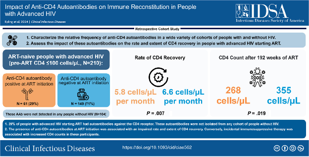 编者按:免疫功能重建不全或免疫无应答是不少HIV感染者面临的治疗难题,可影响感染者预后。目前缺乏明确的免疫重建不全的解释机制和可用于指导预后或治疗的标志物。一项发表于CID杂志的研究,描述了CD4自身抗体在晚期HIV感染者中的发生率可达29%,而且自身抗体阳性的感染者表现出CD4细胞计数更低、免疫反应更差,而对自身抗体的免疫抑制干预一定程度上可以恢复CD4细胞[1]。