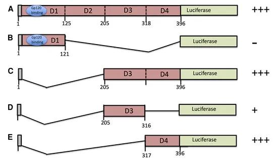 为了进一步验证并反映与CD4受体细胞外结构域的免疫反应性,研究者们使用LIPS免疫检测法,对一组选定的CD4血清阳性和血清阴性的HIV感染者(PWH)样本进行了不同CD4受体蛋白片段的检测(图2)。