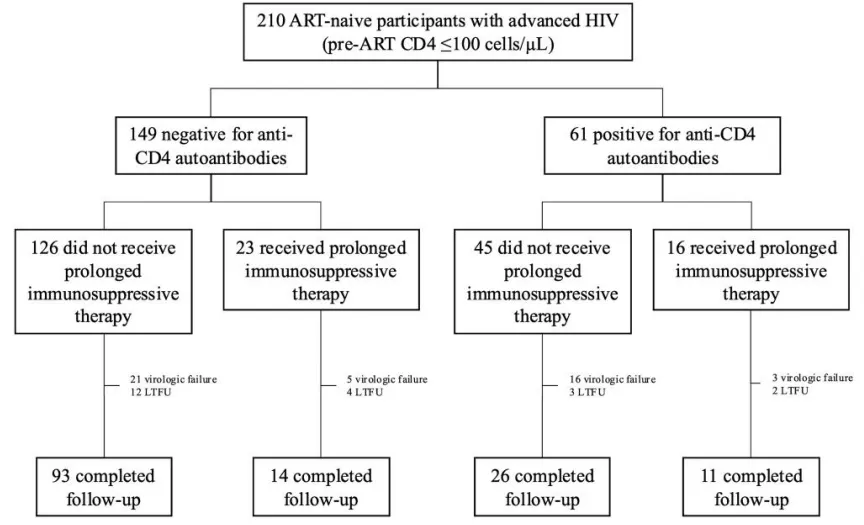 图3. 基是否存在抗CD4自身抗体以及是否接受长期免疫抑制治疗的CONSORT流程图
