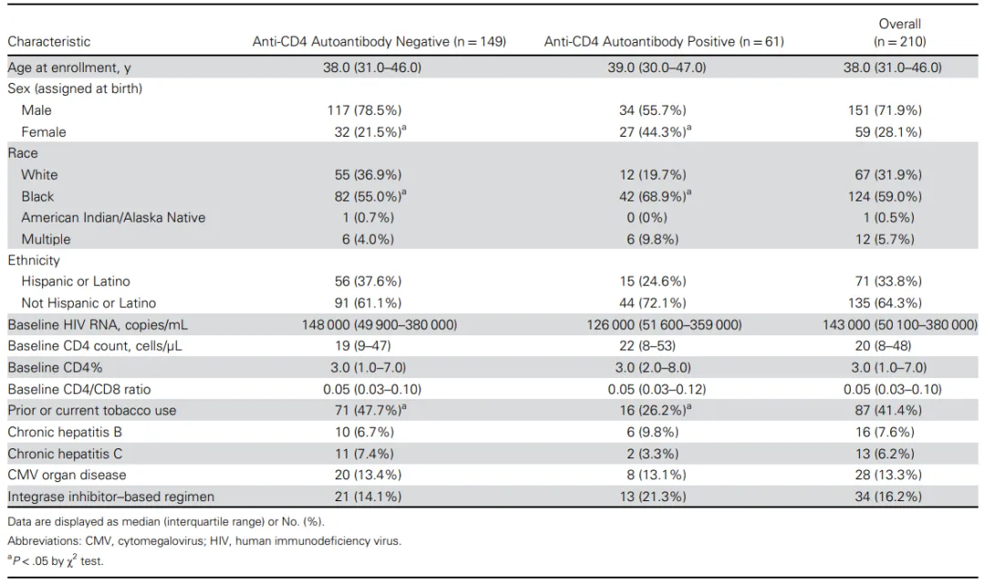 表1.不同抗CD4自身抗体状态的晚期HIV感染者的临床特征