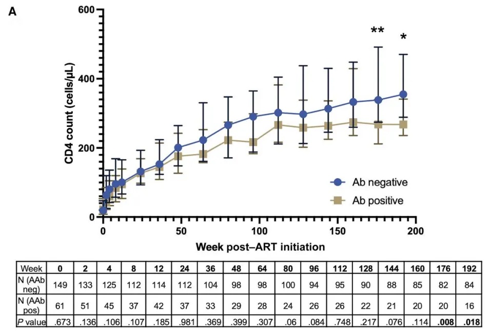 相比之下,未经ART治疗的晚期HIV感染者(29%)、CD4计数大于200细胞/µL的HIV感染者(26%)、LTNPs(9%)有不同程度的抗CD4自身抗体阳性。