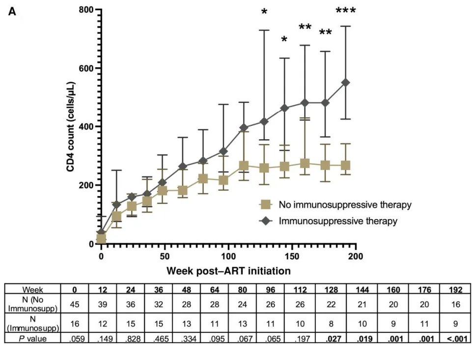 在免疫抑制期间,血清阳性感染者的CD4恢复率显著更高(9.8 vs 17.0 个/µL/月,P = 0.0019)。在完成长期免疫抑制治疗后,CD4恢复率的显著增加持续存在(P < 0.0001;补充图6)。值得注意的是,在这些参与者接受免疫抑制治疗之前,CD4恢复率没有差异(P = 0.31)。接受长期免疫抑制的血清阳性感染者在第96周的中位数CD4计数更高(316 vs 217个/µL),但在单变量(P = 0.064)或多变量(P = 0.42)分析中这一差异并不具有统计学意义(图5A);然而,从第128周到第192周,CD4计数显著更高。接受长期免疫抑制治疗的血清阳性感染者在第192周的中位数CD4计数为551 个/µL,而未接受治疗的参与者为268 个/µL(在单变量分析中P < .001,在多变量模型中P = 0.019);即使排除了患有IRIS的患者,这种差异仍然存在(P = 0.021)。