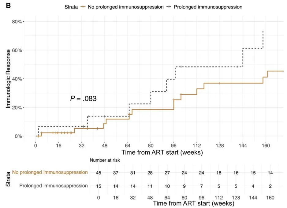 在整个随访期间,血清阳性感染者产生免疫反应(CD4 >350 个/µL)的可能性降低,但差异没有显著统计学意义(HR 0.61;P = 0.10)(图4B)。