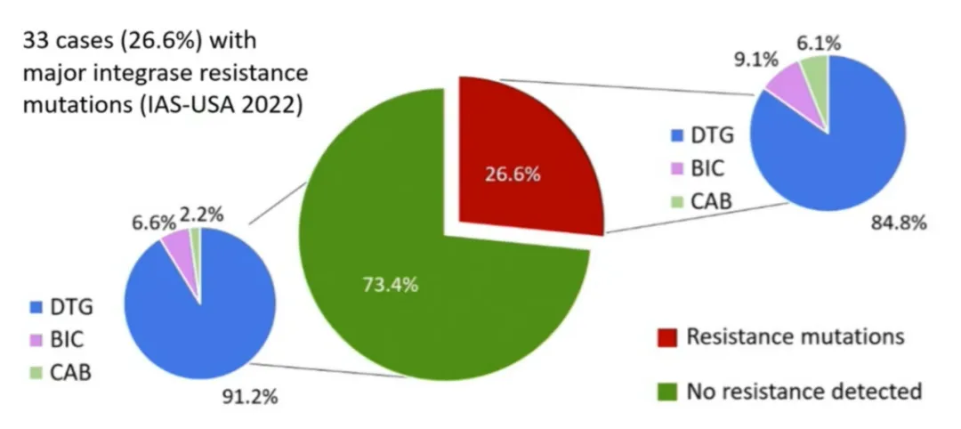 赵清霞教授:ROSETTA是一项全球登记系统[4],收集来自北美、南美、欧洲、非洲等地接受二代ISNTI方案治疗失败的病例,是目前全球样本量最大的第二代INSTI方案治疗失败真实世界案例登记系统。此次报告了125例第二代INSTI方案失败的病例,大多来自DTG方案失败的HIV感染者(DTG 111例;BIC 10例;CAB 4例),在这些第二代INSTI方案治疗失败的感染者中,有33例(26.6%)检测到INSTI耐药突变(DTG 28例;BIC 3例;CAB 2例)。