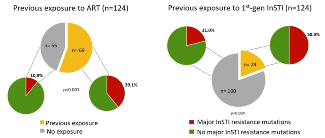 值得注意的是,经治的HIV感染者(39.1% vs 10.9%)、第一代INSTI经治的HIV感染者(50% vs 21%),相较于初治以及未经第一代INSTI治疗的感染者,有更高的耐药率。临床实践中,需注意此类经治患者的发生INSTI耐药风险更高。因此,建议在转换方案时应充分考量患者的ART用药史和耐药史,尽量保证ART方案中具有2个或以上完全活性的药物。