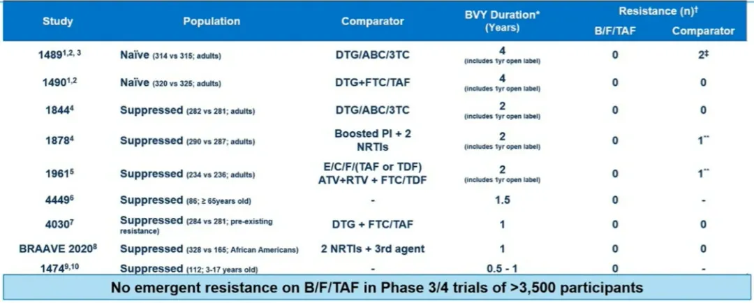 首先,B/F/TAF和含DTG的三药方案是耐药屏障最高的方案,这是目前专家较为认可的,因为三药方案相对而言是更加完整的“鸡尾酒”疗法。在汇总B/F/TAF的相关3/4期临床试验、超过3500例HIV感染者中,在研究随访期间的检测中,没有发现耐药突变。此外,B/F/TAF作为单片复合制剂的另一个显著优势是用药简便,限制条件少,无需等待基线病载、耐药等检测结果。对于一些初级医生或者基层医生而言,B/F/TAF是几乎可以“闭眼入”方案,出错概率较低。尤其对于老年人或者文化程度较低的感染者,多片方案较容易发生错服和漏服。