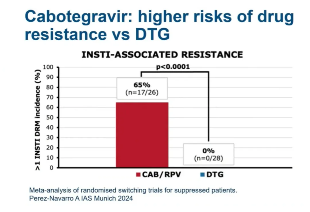 最后,CAB/RPV是耐药屏障最低的第二代INSTI方案,在相关汇总分析中,含CAB方案一线治疗、平稳转换治疗或者病毒血症的二线治疗失败而接受基因型耐药检测的HIV感染者中,CAB耐药突变率高达71%、64%和39%[7]。另有Meta分析显示,CAB/RPV方案的INSTI相关耐药突变风险较DTG方案高65%[8]。