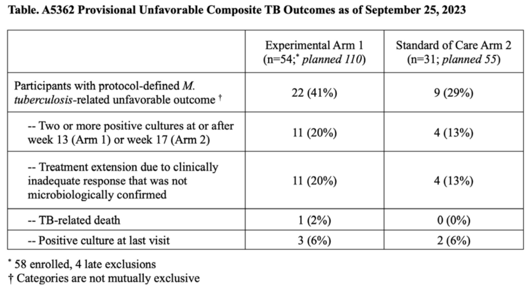 在2021年6月至2023年4月期间,当试验根据DSMB建议因无效而终止时,我们将110名计划参与者中的58名纳入第1组,将55名计划参与者中的31名纳入第2组,将20名计划参与者中的15名纳入C组。大多数参与者为男性(79%),29%为HIV感染者(中位基线CD4+ 细胞计数问哦265cells/mm3,IQR 185-379cell/mm3)。71%的患者患有影像学上的晚期结核病,25%的患者在入院时为3+涂片阳性。中位研究随访时间(IQR)为50.2周(39.7,57.6周)。到第12周,第1组中89%(n=48)的参与者和第2组中90%(n=28)的参与者实现了稳定的培养转化(校正HR 1.17,90%CI:0.79至1.73,校正了基线HIV状态和晚期疾病的存在)。受第1组肌酐清除率变化的影响,第1组中出现≥3级不良事件的参与者的累积比例(46%)高于第2组(16%)(差异30%,90%CI:14-45%)。第1组和第2组参与者的不良结局累积发生率分别为49%(95%CI:34-67%)和34%(95%CI:19-58%)(差异-15%,95%CI:-41%至11%)。下表描述了临床/细菌学不良结局事件。