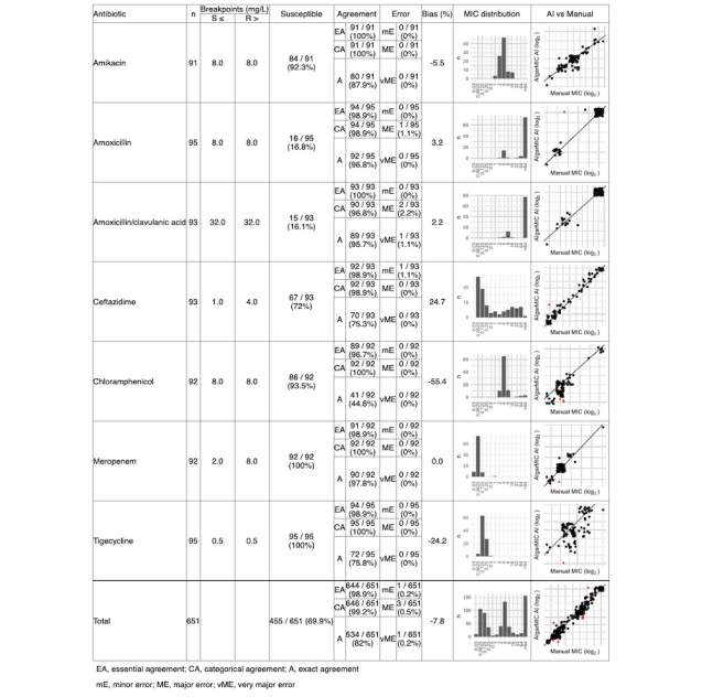 结果显示,在菌落图像的验证数据集上,第一线模型对细菌生长的分类准确率为94.3%。第二线模型将菌落分类为“抑制”或“良好生长”的准确率为88.6%。在验证MIC数据集上,结合两个模型的预测结果与手动标注结果相比,基本一致的比率为98.9%(644/651),偏差为-7.8%。分类一致率为99.2%(646/651),其中小错误率为0.2%(1/651),大错误率为0.5%(3/651),重大错误率为0.2%(1/651)。所有抗菌药的结果均一致,但氯霉素例外,其偏差为-55.4%(即AIgarMIC低估了MIC,这可能是由于该药物在MIC附近容易出现微弱的生长趋势)。
