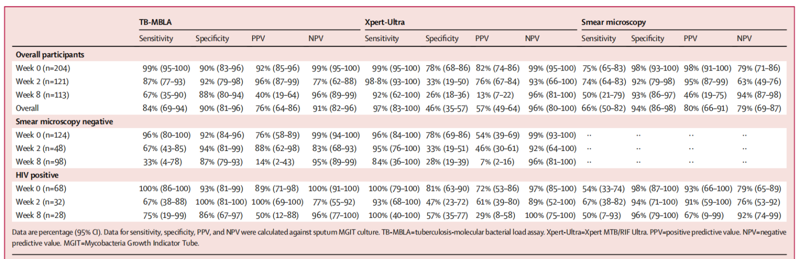 研究者分析了基线时Xpert-Ultra检测结果为“痕量阳性”的10名参与者的其它检测结果,其中8人(80%)的 TB-MBLA和MGIT培养结果均为阴性,2名痕量阳性参与者的TB-MBLA和MGIT均呈阳性,并对治疗做出了反应。因此痕量阳性结果来自存活或死亡的细菌仍不清楚。此外,40%的痕量阳性参与者在基线时曾有结核病治愈史,这表明可能存在结核杆菌的残留DNA。这也解释了Xpert-Ultra特异性较低的原因。