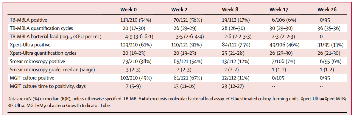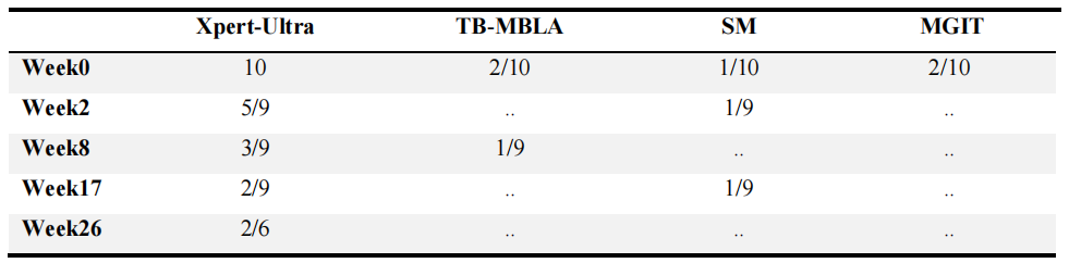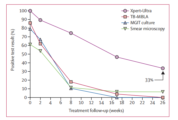 到治疗结束,Xpert-Ultra检测阳性率的下降速度明显较慢;因而在第26周时95人中有31人(33%)的Xpert-Ultra检测结果仍为阳性,而痰涂片阳性的有6人(6%),TB-MBLA或痰培养结果全部阴性。