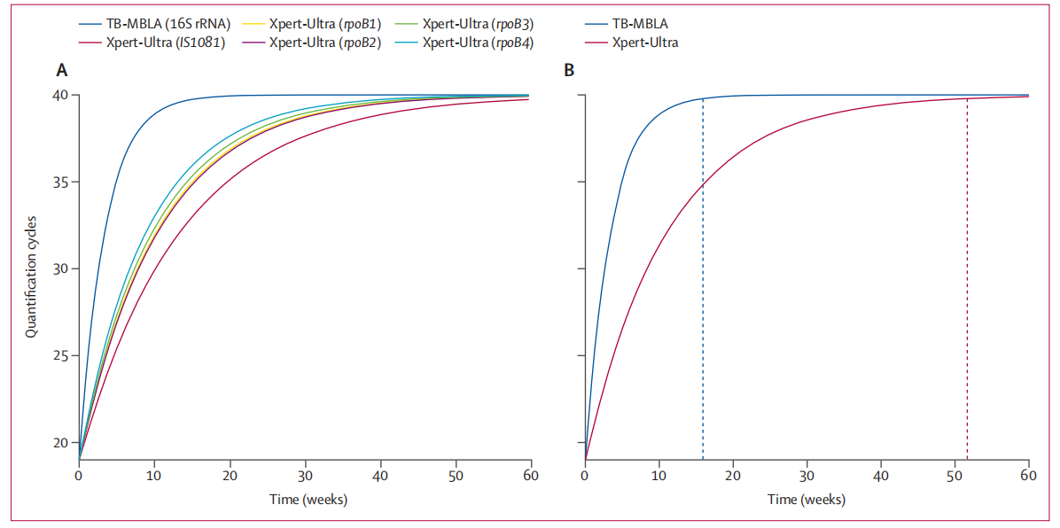 接着研究者为了解释Xpert-Ultra阳性率在治疗结束时仍然很高的原因,通过指数饱和函数模拟PCR Cq值的时间变化来估算结核分枝杆菌DNA和rRNA的体内消除率。结果表明TB-MBLA 16S rRNA达到Cq 40(定量极限)的中位数时间为15.7周(蓝色虚线),Xpert-Ultra基因达到Cq 40的中位数时间为51.6周(红色虚线)。表明结核分枝杆菌rRNA的降解速度快于DNA。基于DNA的Xpert-Ultra的转阴率比基于rRNA的TB-MBLA转阴率慢3.3倍。