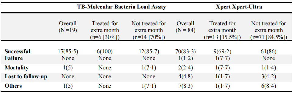 如上表所示,在治疗第8周时(n=113),20名(18%)参与者TB-MBLA阳性,其中有6名(30%)痰涂片检测阳性。84名(74%)Xpert-Ultra阳性,其中13(15%)痰涂片检测阳性。只有8周时痰涂片阳性的参与者额外接受1个月的强化期治疗,然后转为继续治疗阶段。患者无论是否接受1个月额外的强化治疗,治疗成功率相似。治疗结束后3个月的电话随访显示这些患者均未出现类似结核病的症状。