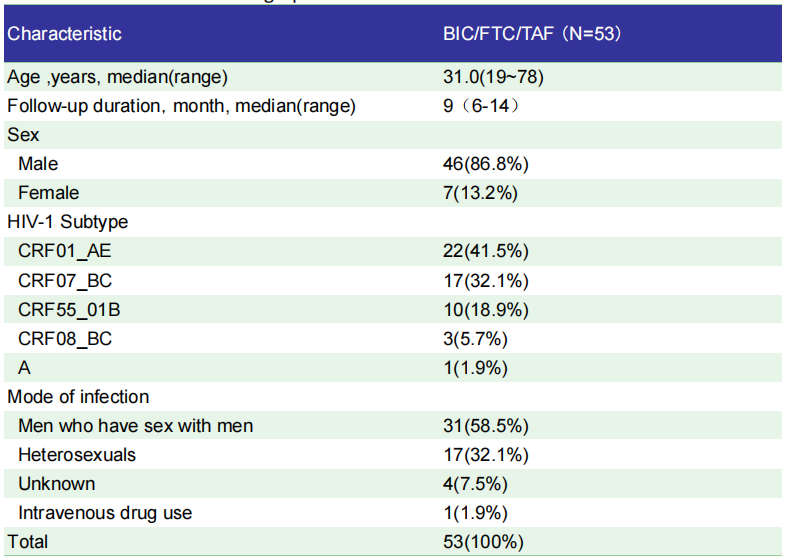 在829例实施了治疗前耐药检测的HIV-1初治患者中,有202例患者存在治疗前耐药基因突变,其中53例(6.4%)明确耐药的患者使用了B/F/TAF治疗。46位患者为男性,中位年龄为31.0岁。最常见的HIV-1亚型为CRF01_AE(22/53,41.5%),中位随访时长为9个月。基线CD4细胞计数和中位HIV-1 RNA载量分别是255 cells/mm3和133 840 copies/mL。