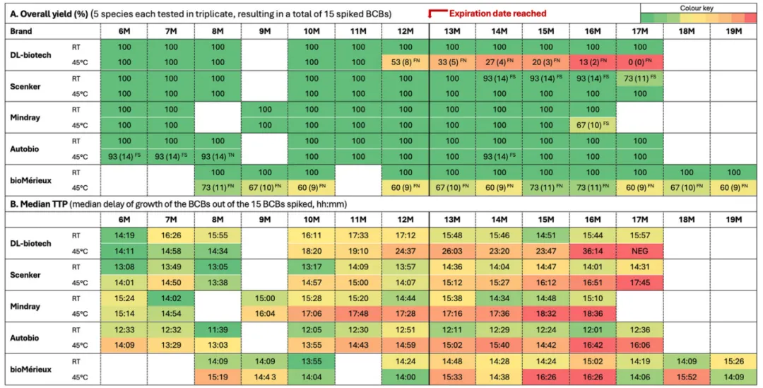 △在室温和高温/高湿条件下,直至过期日期及之后储存的加标BCBs性能概览。图A展示了每个评估时刻的总体产率(真阳性百分比)。图B给出了每个评估时刻15种加标BCBs所有真阳性的中位TTP(至阳性时间)。RT=室温,M=生产后月数,空白单元格=未进行。FN=假阴性BCB(无信号但亚培养生长),TN=真阴性BCB(无信号且无亚培养生长),FS=假信号BCB(孵育后4小时内出现信号)