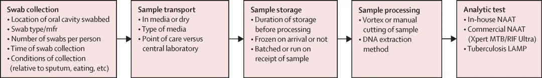 口腔拭子分子检测肺结核的系统综述中,口腔拭子的敏感性在成人中为36%-91%,在儿童中为5%-42%。患有少杆菌性疾病和参考标准不完善的儿童中,口腔拭子检测敏感性降低。当使用不同的检测方法时,口腔拭子作为临床标本的敏感性在成人和儿童中都是不同的。特异性比敏感性变化更小,大多数研究报告特异性大于90%。优化样本处理方法包括拭子类型、取样的位置和NAAT,可以提高口腔拭子的诊断准确性。与脸颊或牙龈相比,从舌头收集的样本中MTB DNA的Cq值明显较低(较强的PCR信号)。与Whatman OmniSwabs和Puritan Purflock Ultra Swabs相比,Copan floq拭子能着增加收集到的生物量从而增强灵敏度。Xpert MTB/ RIF Ultra的方案对患有结核病的成人进行的研究,证明使用Xpert MTB/RIF Ultra的口腔拭子具有高敏感性,总体灵敏度为72% (95% CI 59-83),特异性为100% (95% CI 97- 100),口腔拭子研究的共识平台协议,其标准化拭子收集、处理、储存和其他程序的程序将提高研究内部的一致性,促进研究之间的比较,并允许更准确的准确性估计。由于采样地点、拭子类型、运输和储存方法以及所使用的NAAT类型存在相当大的异质性,以及每种组合的研究数量有限,综述无法按照方案中流程图进行Meta分析。未来的研究使用标准化的方案来比较口腔拭子收集和处理的不同方面有利于不同层面的分析。