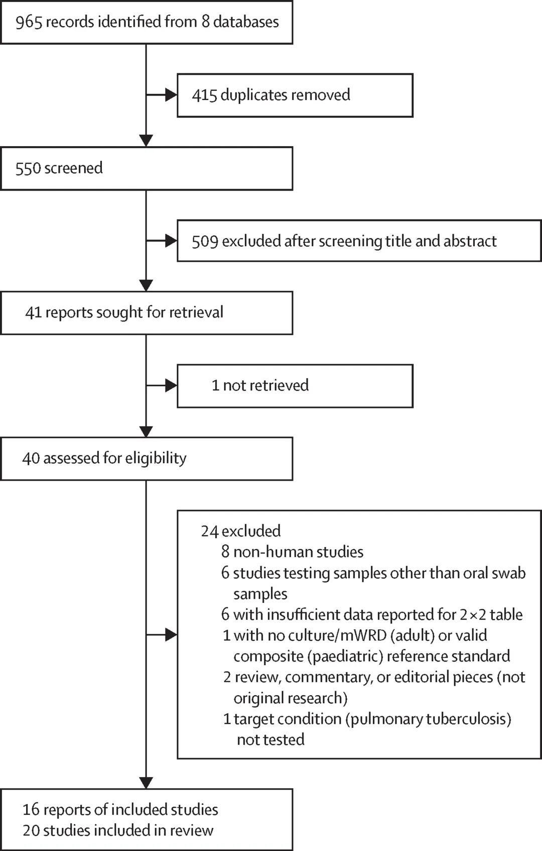 2000年至2022年7月5日在8个数据库中MEDLINE、Embase、Scopus、ScienceCitationIndex、medRxiv、bioRxiv、Global Index Medicus、Google Scholar检索,检索词: ((“Mycobacterium tuberculosis” OR “tuberculosis” OR “TB” OR “pulmonary tuberculosis”) AND (“oral swab*” OR “tongue swab*” OR “buccal swab*”))获得了965条记录,删除415条重复记录,并根据题目和摘要排除了509条记录,确定了41篇全文综述。其中一篇无法获得研究的全文,也无法联系到作者,因此排除了这篇研究。最终有16份文献20篇文章符合纳入标准的报告。16篇报告的20项纳入研究在8个国家进行,包括南非(7项研究)、秘鲁(5项)、乌干达(3项)、韩国(1项)、肯尼亚(1项)、巴西(1项)、中国(1项)和摩尔 多瓦(1项)。此综述中纳入了20项研究(3083名受试者)。