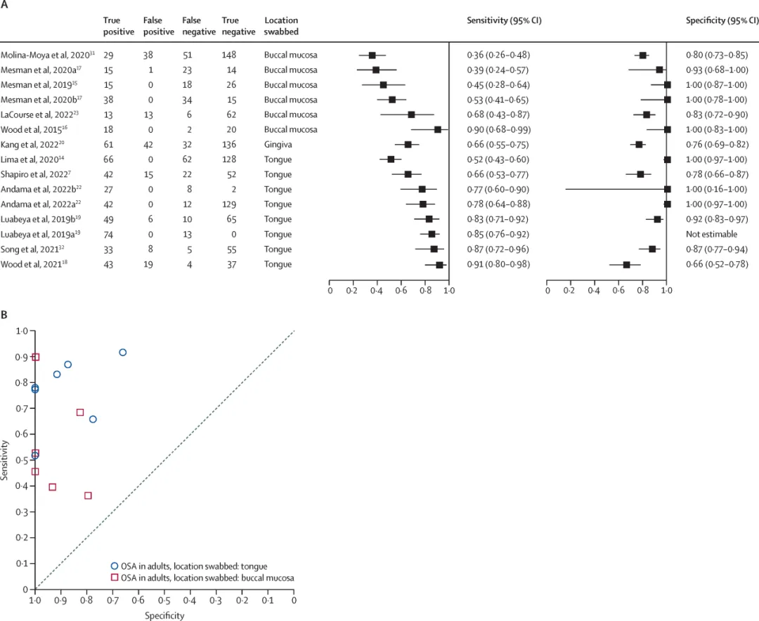 图3. 成人口腔拭子的Forest图(A)和SROC图(B)