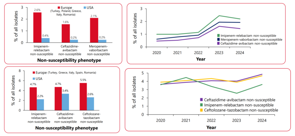 △2020-2024年欧美国家新型BL/BLI不敏感的肠杆菌目细菌(上)和铜绿假单胞菌(下)的交叉耐药