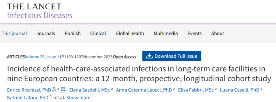 Ricchizzi, Enrico et al. Incidence of health-care-associated infections in long-term care facilities in nine European countries: a 12-month, prospective, longitudinal cohort study. The Lancet Infectious Diseases, Volume 25, Issue 11, 1199 - 1207