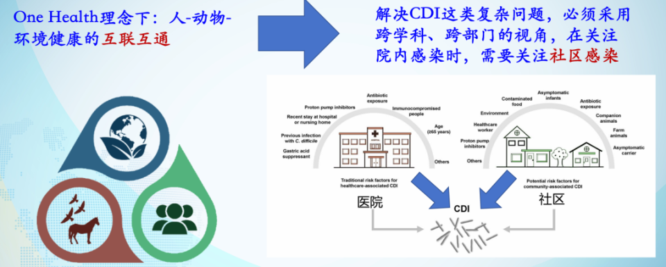 随着社区相关性CDI病例的显著上升,一个关键问题浮现:那些没有传统感染危险因素的感染者,究竟从何而来?这一问题亟待从更广阔的视角进行探索。在此背景下,“One Health”理念为我们提供了重要的分析框架。该理念强调人、动物与环境健康的互联互通,主张采用跨学科、跨部门的视角应对复杂健康问题。在关注院内感染的同时,必须将社区感染纳入整体防控体系,才能全面理解并有效遏制CDI的传播[3]。