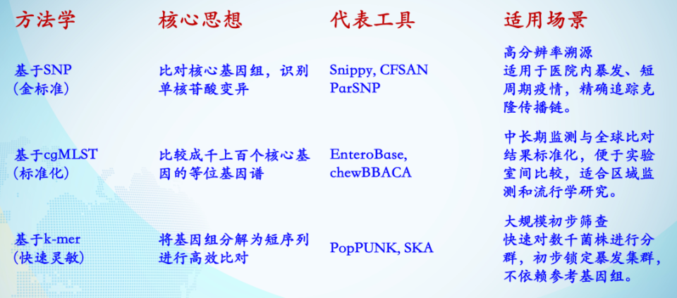 应对艰难梭菌的传播,必须依靠精准的溯源工具与多部门协同的策略。分子流行病学为揭示传播链提供了关键技术支持。目前主要方法包括基于SNP的分析,如Snippy、CFSAN ParSNP,适用于高分辨率溯源,特别是医院内暴发和短周期疫情的精确追踪;基于cgMLST的方法,如EnteroBase、chewBBACA,适用于中长期监测与全球比对,结果标准化便于实验室间比较;基于k-mer的工具,如PopPUNK、SKA,适用于大规模初步筛查,快速分群锁定暴发集群。这些工具共同构成了“侦探的工具箱”,助力揭示隐藏的传播网络。